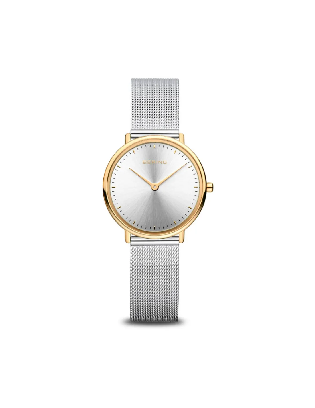 Reloj Bering Ultra Slim 15729-010 para mujer con caja de acero color oro brillante, esfera plata y pulsera de malla milanesa. Movimiento de cuarzo.